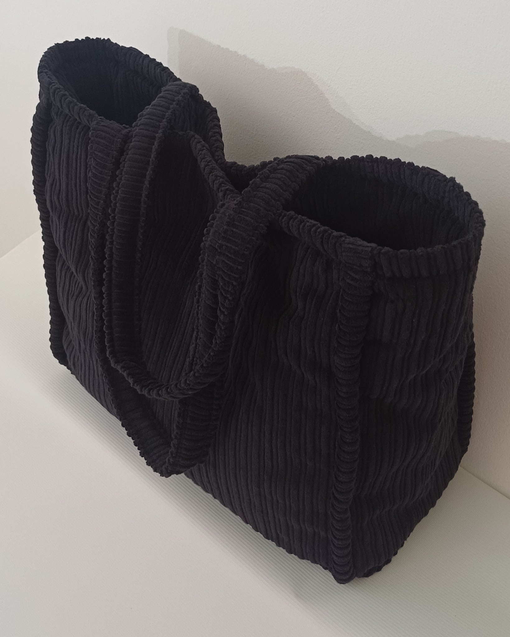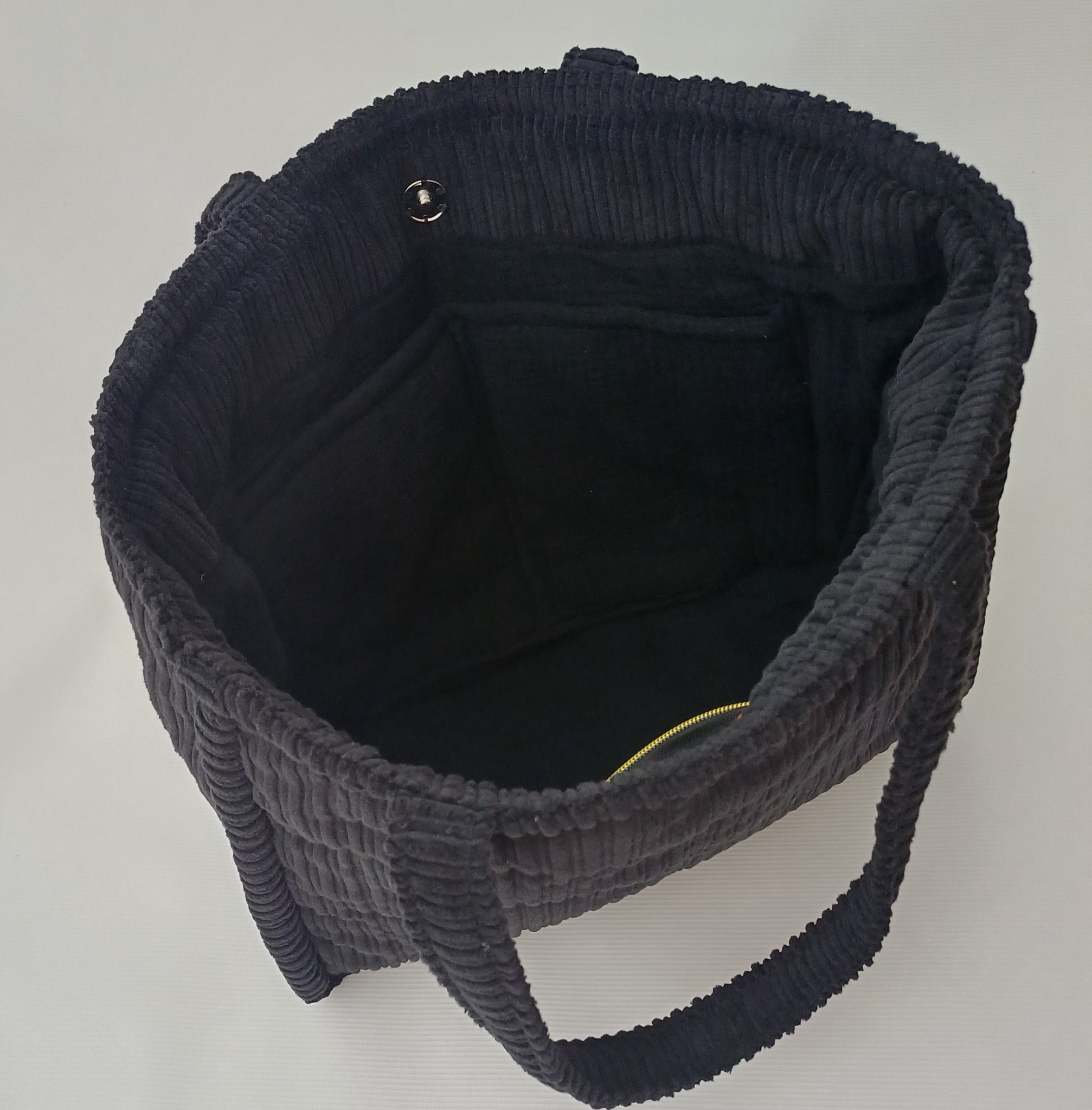 Black Jumbo corduroy , quilted for extra strength , lined with soft cotton gauze in black.