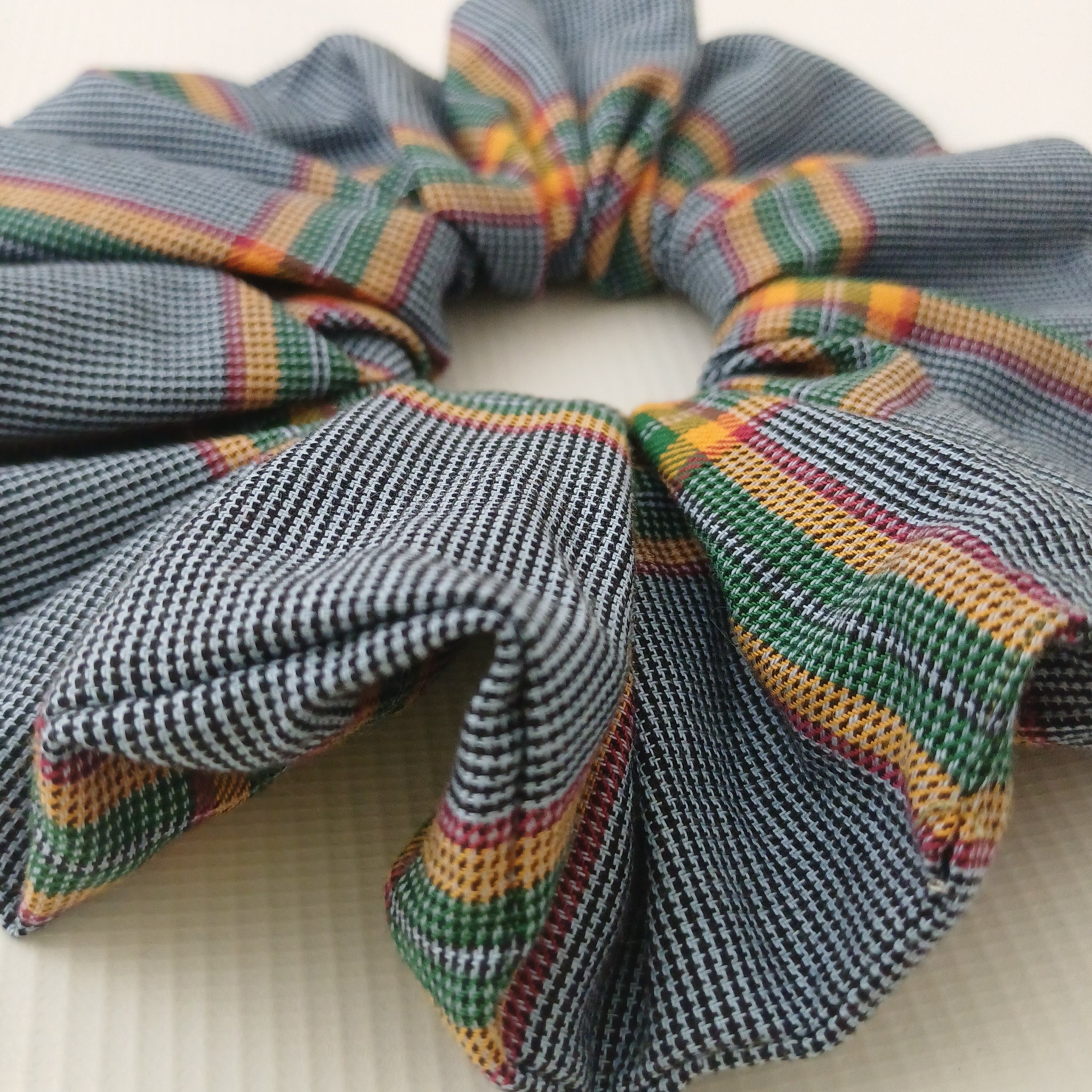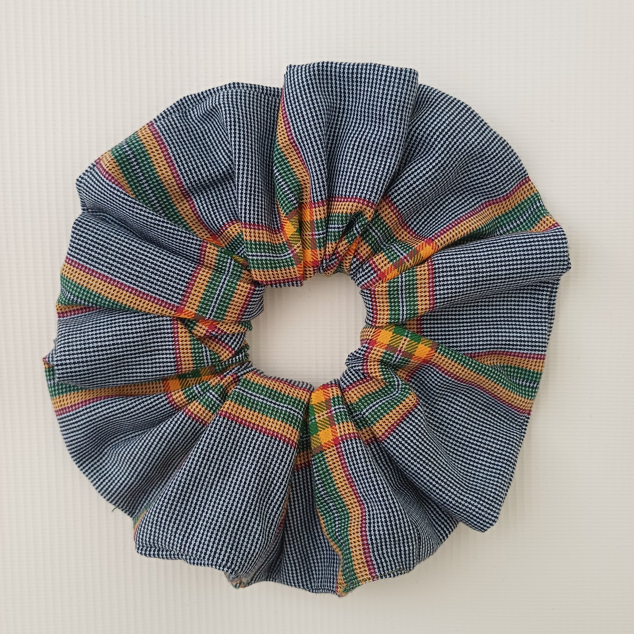 100% Cotton scrunchies in a woven color palette of black, white ,green and mustard yellow and touch of red.